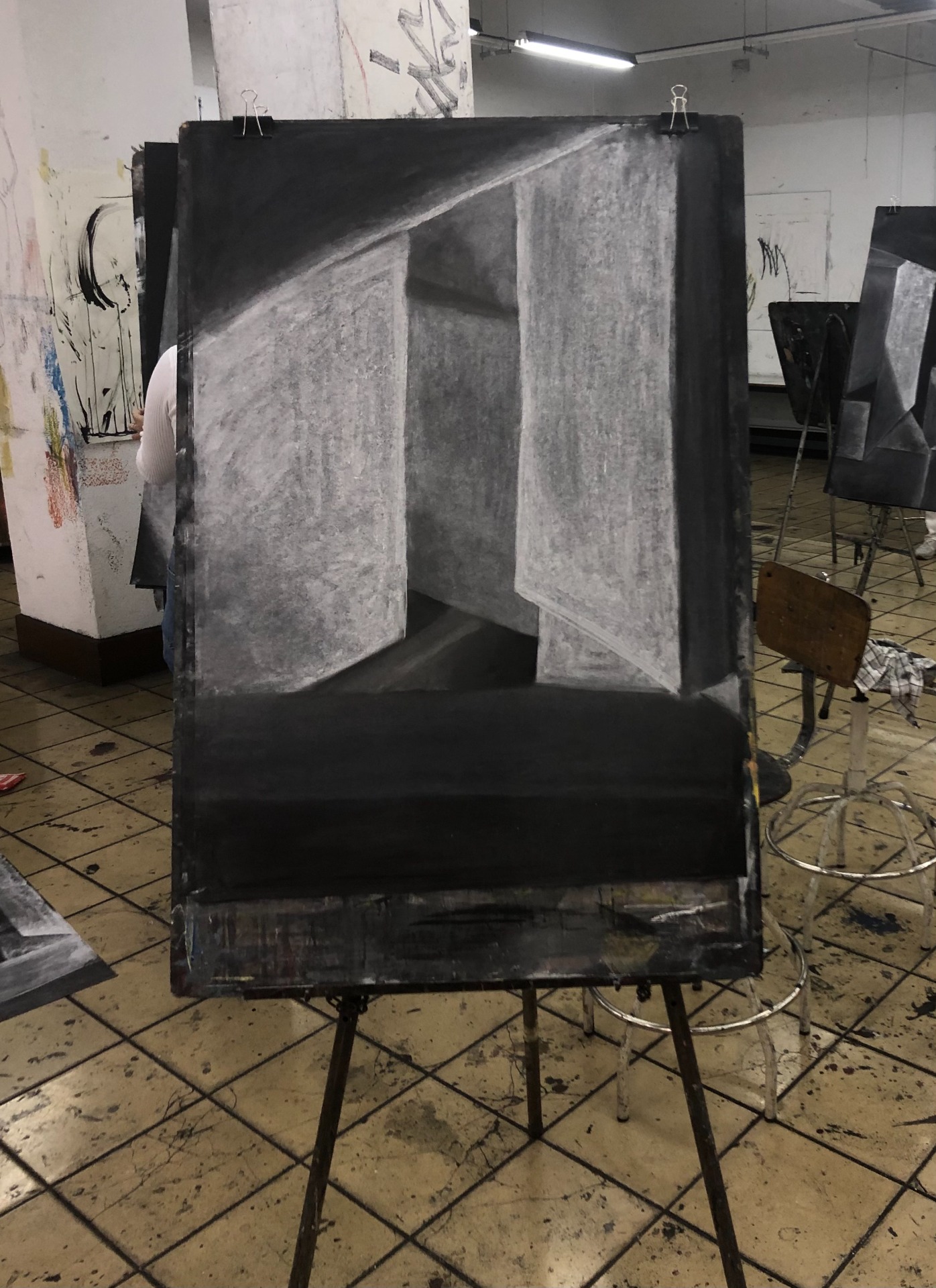 Últimamente en las clases de DAI, lo único que puedo ver son una serie de espacios formados por las luces y sombras que se esconden entre las cajas. Al principio me parecía muy frustrante ya que, aunque en la realidad podía reconocer perfectamente esos espacios y distinguir la distinta intensidad con las que estaban iluminados, a la hora de plasmarlos en el papel no conseguía obtener los resultados que a mí me gustaría. De hecho, había algunos dibujos en los que no se reconocía ningún espacio, llegando a ser un dibujo bastante plano y sin mucha tonalidad de grises. Sin embargo, en la clase de ayer nos dijeron que comprásemos papeles negros y tizas, para intentar hacer lo que estábamos haciendo hasta el momento, pero al revés. Ya no se trataba de dibujar las sombras y de dejar huecos en blanco para poder representar la máxima luz de nuestro modelo, sino que ahora teníamos que dibujar la luz, con distintas tonalidades de blanco y dejando huecos en negro o incluso usando el carboncillo para representar la máxima oscuridad. Al principio pensé que mis dibujos iban a ser un desastre, ya que si en fondo blanco con el carboncillo no conseguía dibujar lo que quería, con unas tizas que al difuminarlas con el fondo negro casi se borraban, mucho menos. Para mi sorpresa, el último dibujo que hice con este formato y esta técnica de tiza sobre fondo negro creo que ha sido de los mejores si no el mejor que he hecho hasta ahora. Creo que en parte tiene que ver con el tiempo que dediqué a hacer este dibujo, ya que estuve casi 2 horas intentando perfeccionar cada detalle, cada sombra, cada contraste, luz, etc. Además, me pareció mucho más fácil pintar con las tizas ya que eran más fáciles de difuminar y corregir errores si me equivocaba. Sé que mi dibujo no está perfecto ni mucho menos, de hecho es bastante mejorable, pero comparando con los dibujos anteriores estoy bastante satisfecha :)